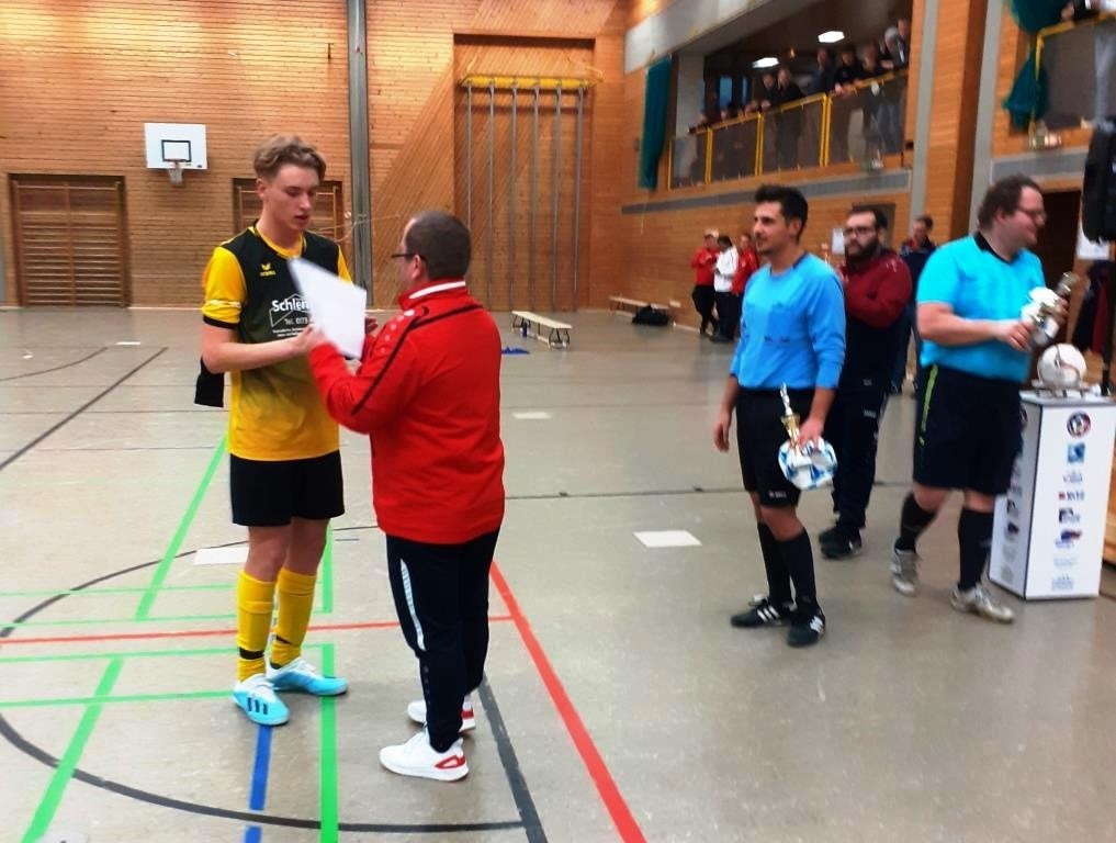 Der nächste Schritt war das Spiel im Halbfinale gegen Haunstetten (Tabellenerster der KL Augsburg). Ein Hammerlos. Ein Team mit höheren Spielqualitäten als in die Teams in der Gruppenphase. Die Taktik des Gegners ging jedoch nicht ganz auf. Mit Angriffspressing und schnellen Umschaltspiel, setzten wir immer wieder die Haunstettner unter Druck. Folgerichtig erzielte dann Tim Meyer einen sehenswerten Treffer zum 1:0, der zugleich den vielumjubelten Endstand darstellte.