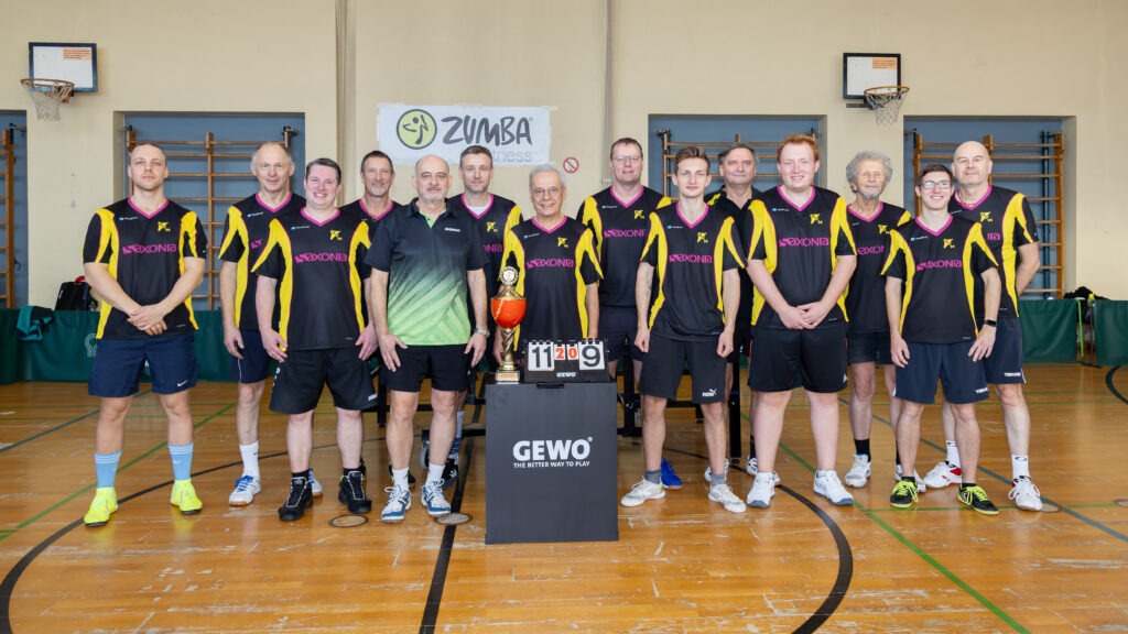 Ein Bild mit den Teilnehmern der Vereinsmeisterschaft, dem Trikot Sponsor und Geschäftsführer der Firma Saxonia (2. v.l.) – Michael Niegel, sowie weiterer Zuschauer.